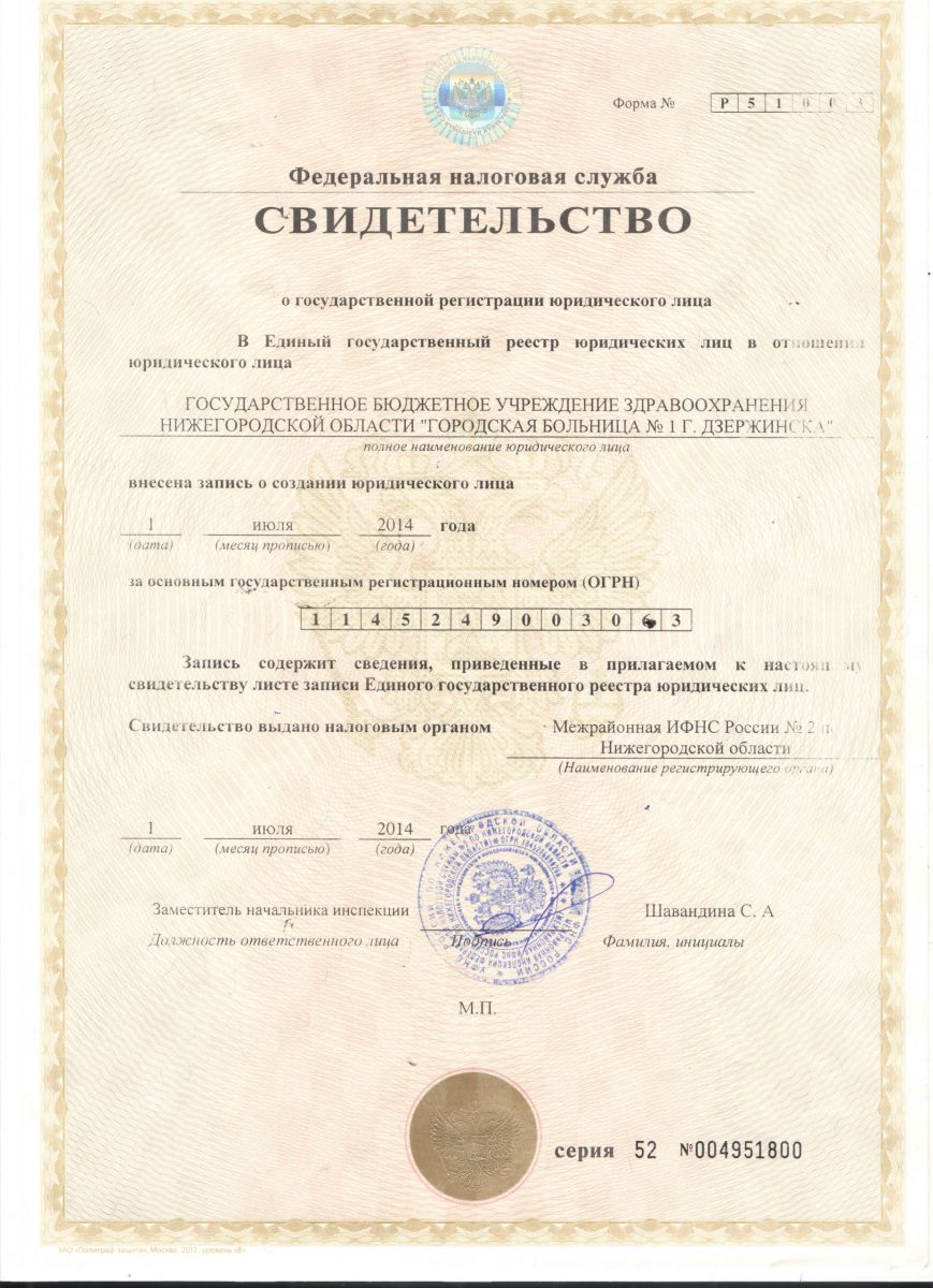 Скачать/Посмотреть Выписку из реестра лицензий ГБУЗ НО «Городская больница №1 г. Дзержинска»